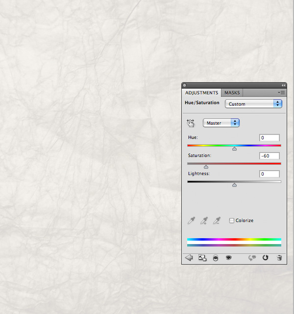 The saturation is looking a bit intense on this texture, so I apply a hue/saturation adjustment layer. Be sure to apply a clipping mask to your adjustment layers, so that they only effect the layer directly beneath them. To apply your clipping mask go to layer>create clipping mask.