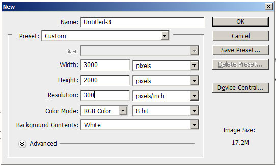 Create a new document of size 3000 px width and 2000 px height and set its resolution to 300 dpi.