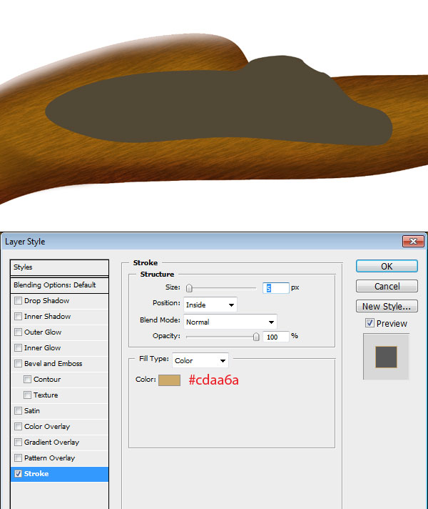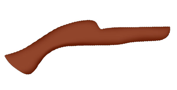 To make barrel, select pen tool and create barrel shape and fill it with colour #734b32. Select gold texture brush, set its colour to #d6b56f and start creating gold texture to the gun barrel.