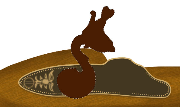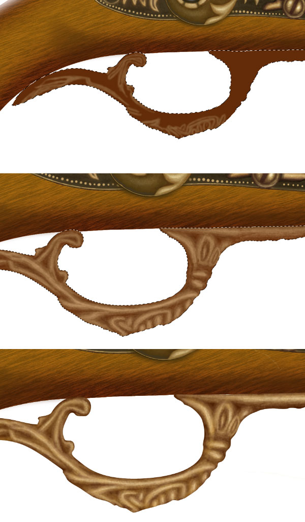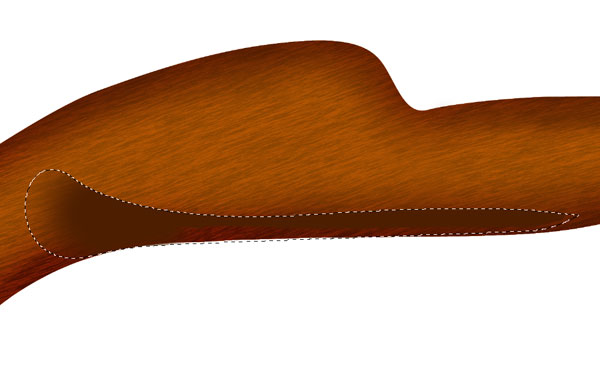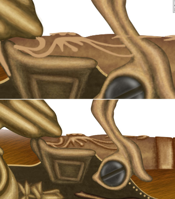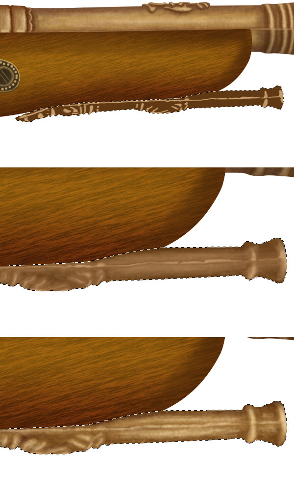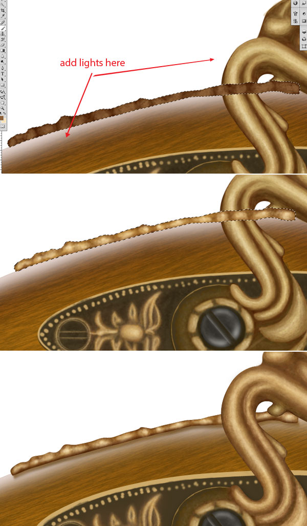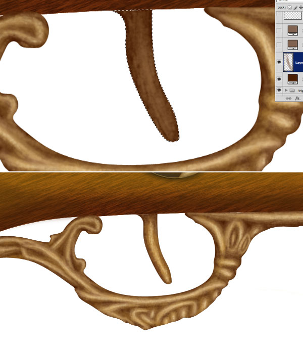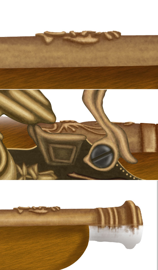 Now repeat the step 52 and create top left gold ornament of gun. Add shadows to the ornament, Ctrl + click to the shadows then add layer mask to the light reflection layer of wooden base. This will make shadows perfect. Similarly create lower gold portion of gun, pay special attention to the light source and shadows.