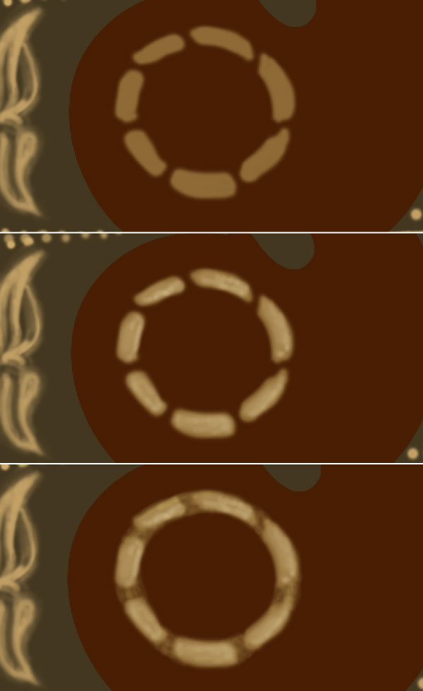 Set foreground colour to #8e6a35, select a soft brush of size 10 pixels and create a dashed ring. Next, select a soft brush of colour #b3945d and start adding lights to the ring and then select a brush of colour #e4d4a8 and add some sharp lights to the ring. Now add some shadows to the ring with a soft brush of colour #c8b163 and opacity 40%.