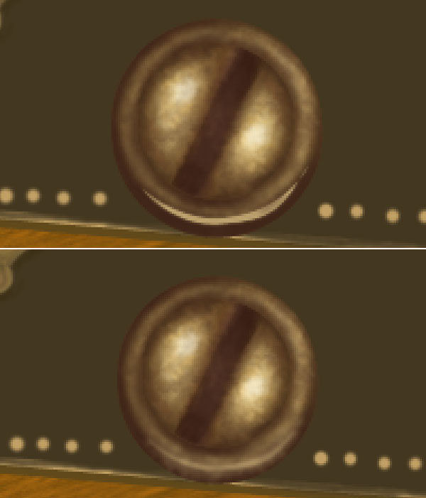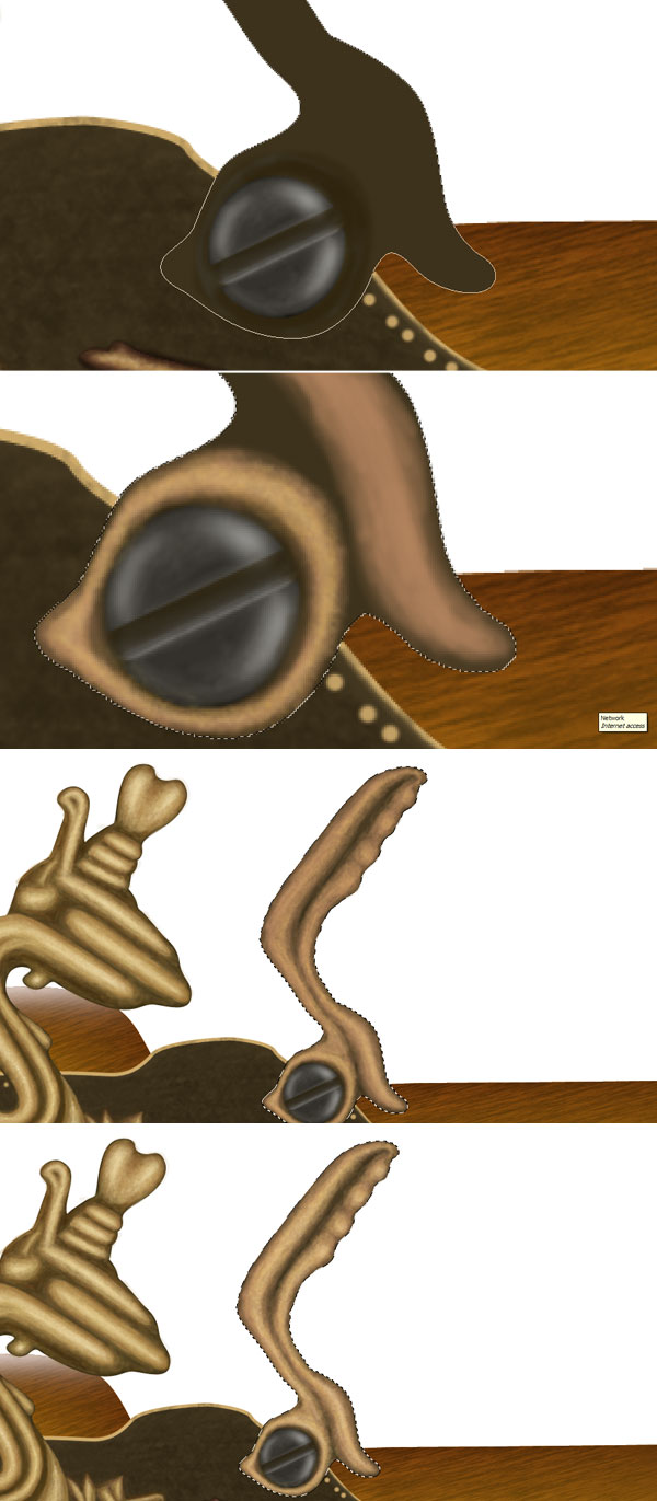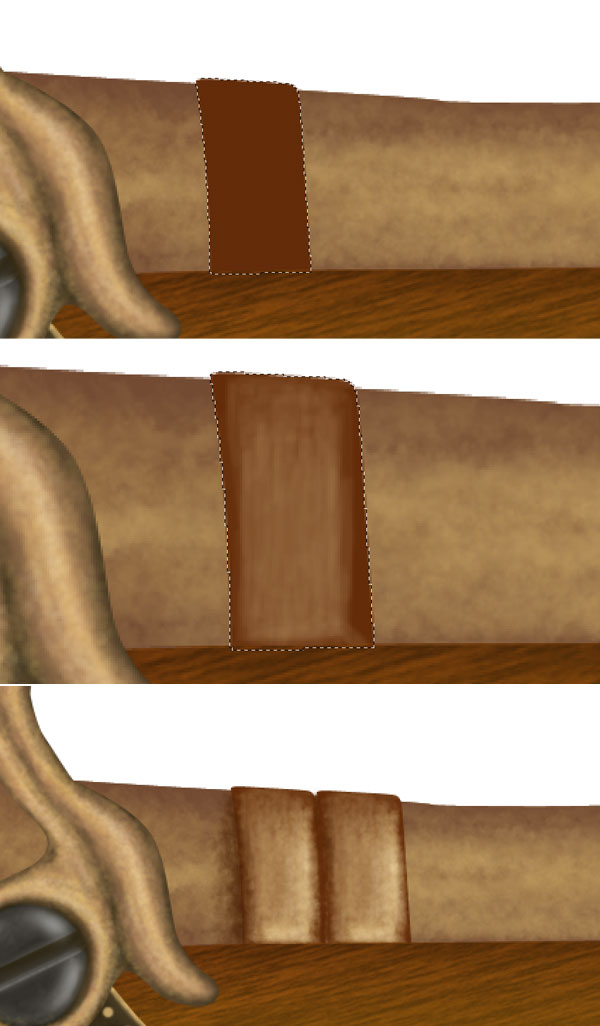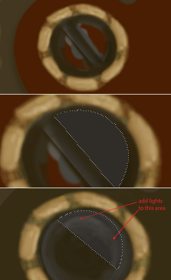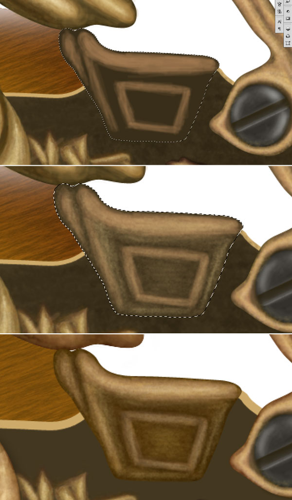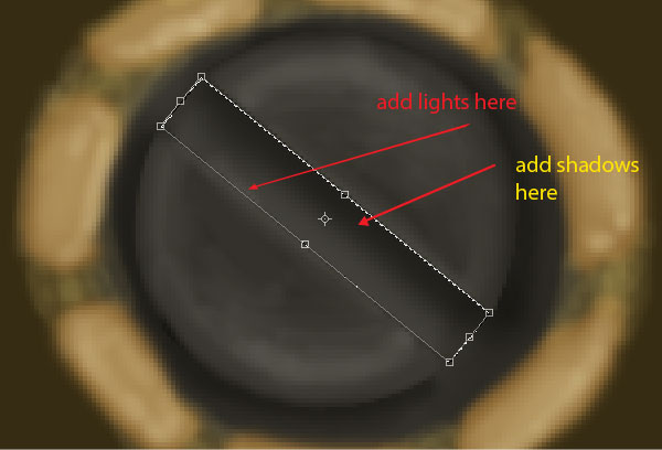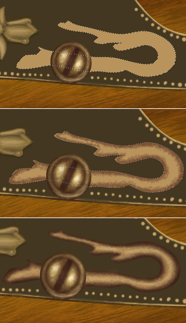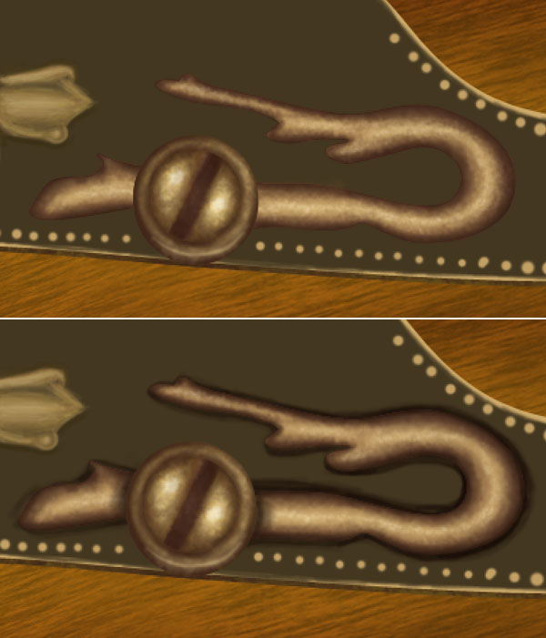Change the foreground colour to # 816837 and add some textures to the lever. Next Ctrl + click gold lever layer to get its selection, invert the selection then set foreground colour to # b2914a and create golden border of lever.