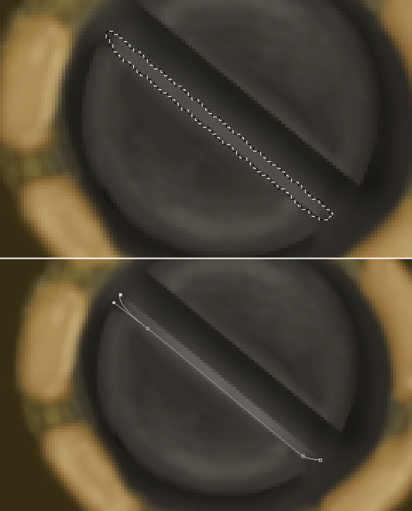 Create a selection to the edge of half screw and fill it with colour #524f4a. Now turn path layer on by clicking to the icon right to shape layer icon and create a path on the edge of half section of screw.