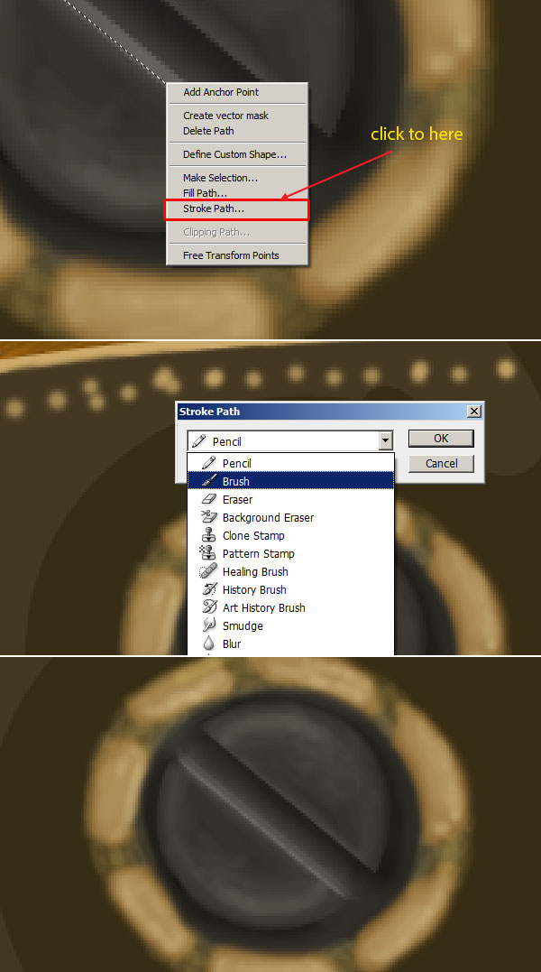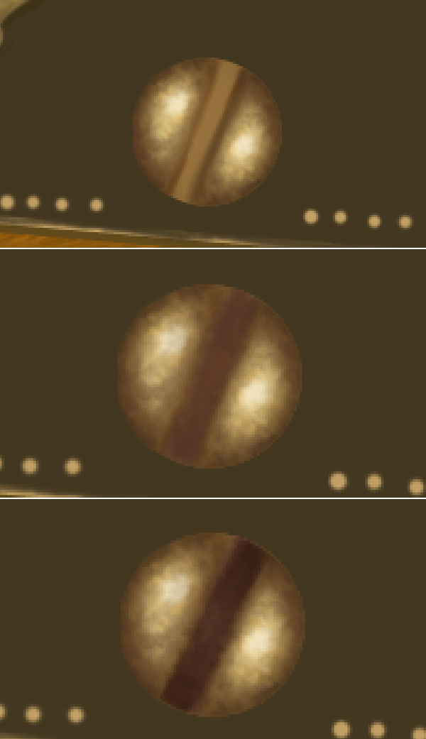 Now we will create the gold screw for this create a circle and fill it with colour # 95703b. Select a soft brush of colour # 523d21 and draw the half portion of screw, change the brush colour to # b49b66 and add some details. Select the brush which you created in step 30, change its colour to #dec07e and add lights. Change foreground colour to # dec07e and add some sharp lighting to the screw.