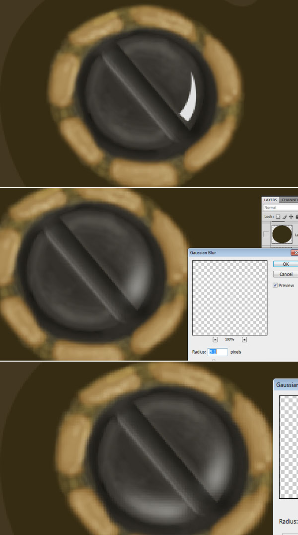 Here we will add some additional lights to the screw ring for this create a shape with pen tool, change its colour to #b89d6b and apply some Gaussian Blur of radius 3 pixels.