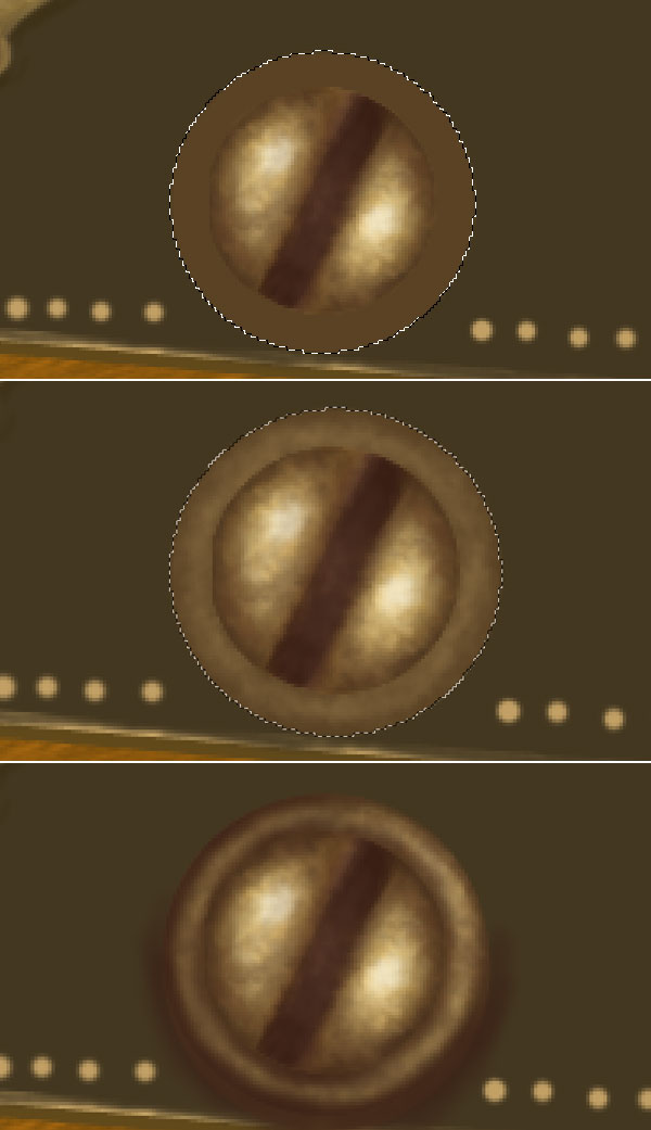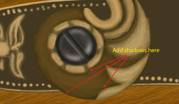 Select a soft brush of colour #a67c52 and follow the steps 34 & 35 to create middle gold button. Add some shadows to the button with a soft brush of colour black.