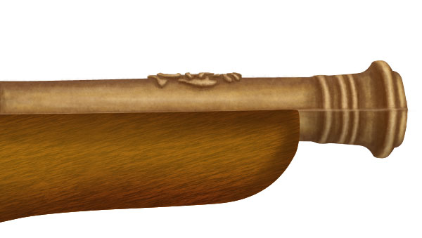 Now we will create a small cannon attached below the gun barrel for this select a brush of size 5 pixels, hardness 50% and colour #8c6239 and create basic highlights of small cannon. Change foreground colour to #c69c6e and add some shading to the cannon. Finally select “gold texture” brush, change its colour to #e3c585 and add some lights & shadows to the small cannon to make perfect.
