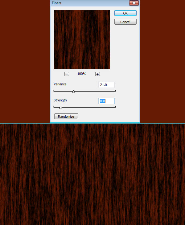 To create wooden texture for wooden base layer, create a new document of dimension 1000 px X 1000 px. Set foreground colour to #651c04 and fill same colour to layer. Now set background colour to black, go to Filter > Render > Fibers and set these values; Variance = 21.0, Strength = 8.0.