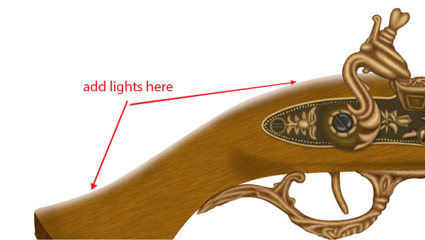 Now add some sharp lights to various parts of gun for this repeat the step 41 and add lights to flower, lever and ornament.
