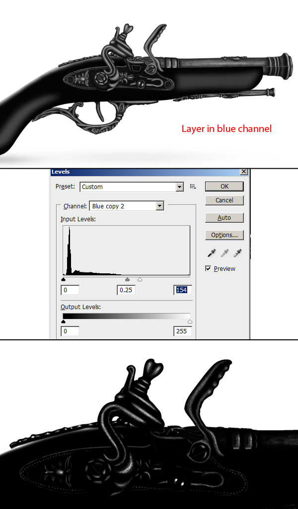 We are about to finish this tutorial, now we need to add some finer details. First we will add a sharp light reflection in gold texture for this go to the channel palate and click on each channel separately to check if image have enough contrast. Here our image have high contrast in blue channel hence, duplicate blue channel and press Ctrl + L to access level adjustment window and apply these settings; 0, 0.25, 154.