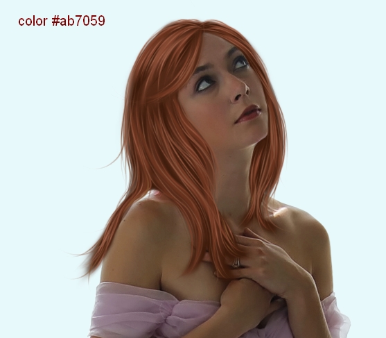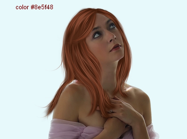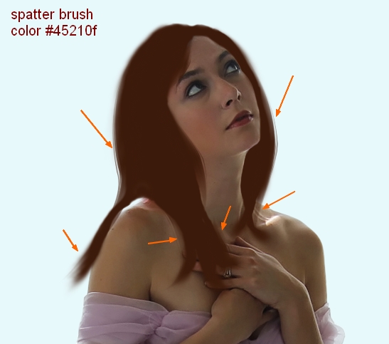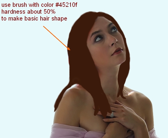 Create a new layer on the top. Use brush with a dark color to make a basic hair shape covering the original hair. I choose color #45210f and brush with hardness about 50%. You don’t need to draw a really neat and perfect edged one as we will add more element to it later.