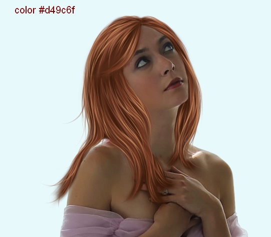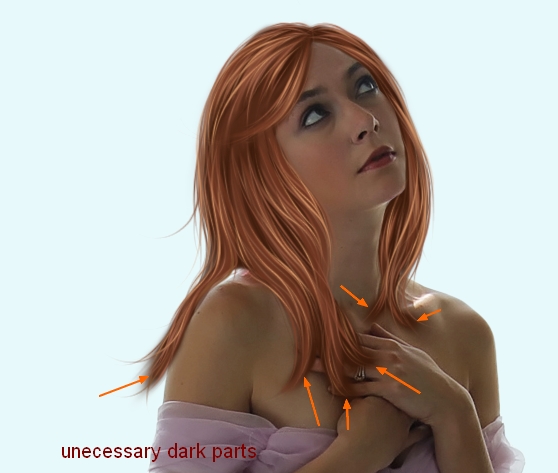 We can’t use original hair as a reference so we have to paint a shape for this new hair. I recommend you to find a photograph with similar pose to look at and you can know how the hair shape should be. There are many kinds of hair style ( so many ways of painting) but for this tutorial purpose ( a young dreaming girl with a classic dress in a gorgegous twilight scene ) I decide to create a medium-length hair with very small curly strands falling naturally. Because model head bends gently to left side ( from viewers eyes) so the part on the left side must be a bit longer and the one on right side a bit shorter ( unless you want to draw a strange surreal hair or revolting one