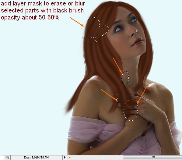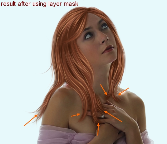 I notice that there are some unecessary dark part at the bottom of hair strands. It’s caused by the basic hair shape and smudging. So I come back to these layers , add layer mask for them then erase and blur these ones: