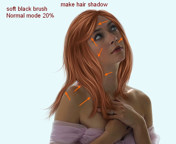Make a new layer and place it under all hair ones. Use black brush with small size to paint along hair shape to make shadow for it. Lower opacity to 20%: