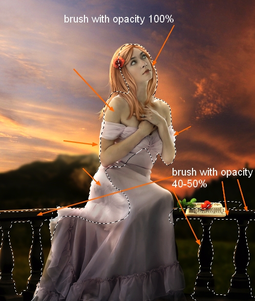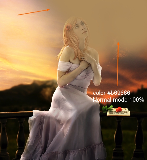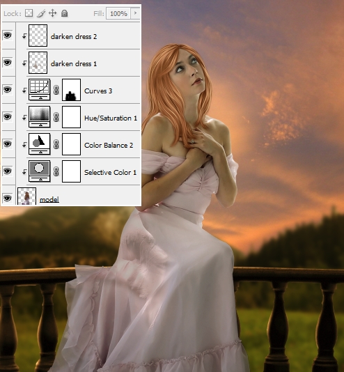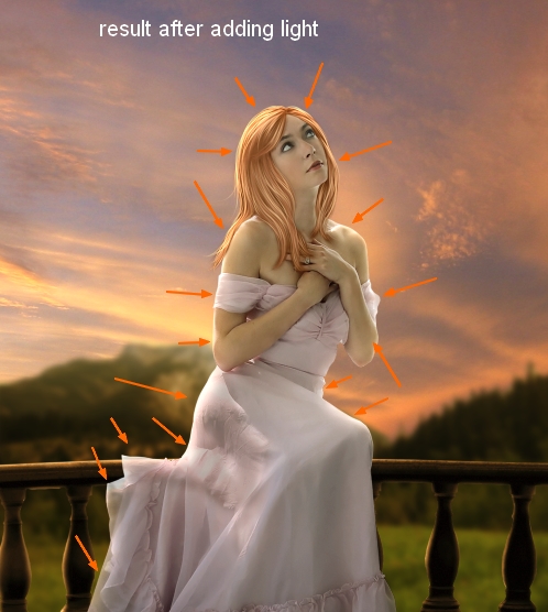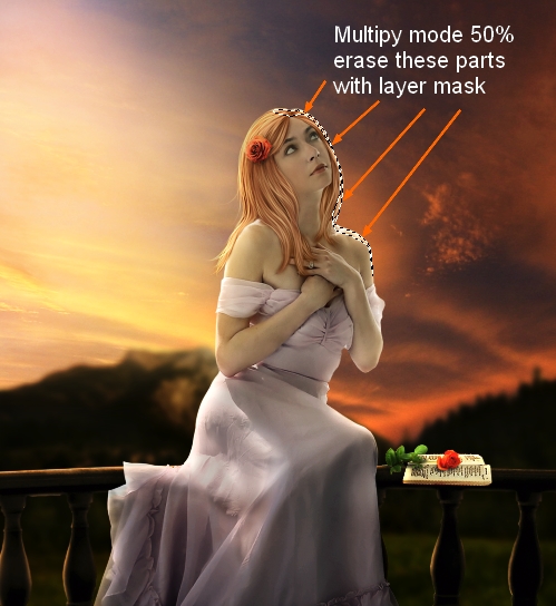 Merge all transparent layers ( extracted model, hairs and hair shadow). Now our girl is ready. Move her into sunset picture, resize and place her onto the balcony: