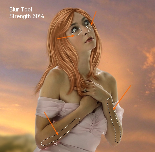 I want to retouch model skin to create a smoother look. Make a new layer ( Clipping Mask) and use Blur Tool ( R key) with Strength about 60% to paint under model eyes and along the arms ( remember to check Sample All Layers on property bar).