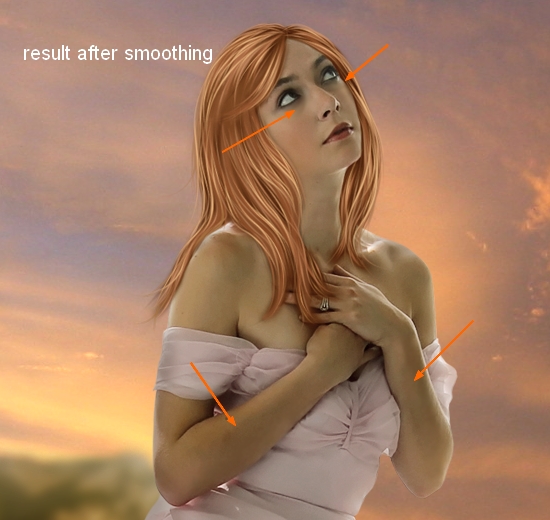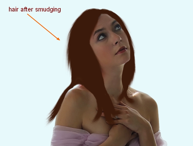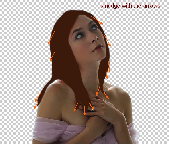 Lower size of this brush to about 30-40 px to fit the part that will be smudged. Turn off background, fill layer so they will not be impacted by smudging process. Use this brush tool to stretch out the hair shape and create some small and tiny hair strokes. It must follow the direction of the falling strands. You can see how I do it with the arrows below: