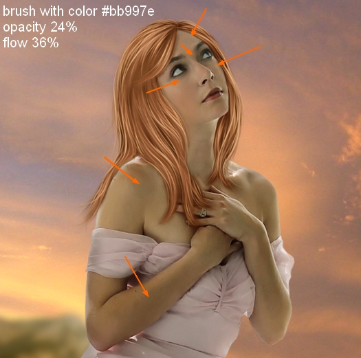 To make some parts of model skin brighter, make a new layer and use soft brush with color #bb997e, opacity about 24%, flow about 36%. Paint gently around the eyes, forehead and dark parts on arms and shoulders. Don’t paint twice on one part as you can lose the details.