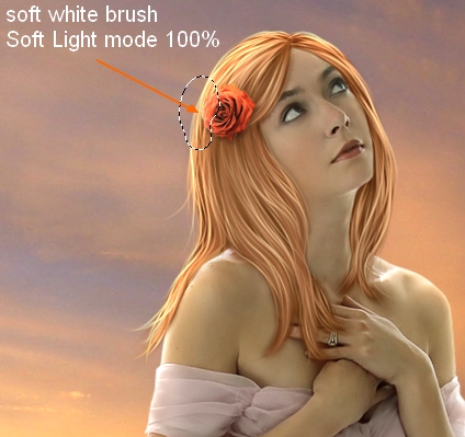 To make the part of this rose which catches light from background brighter, make a new layer ( Clipping Mask) and use soft white brush to paint over this part. Change the mode to Soft Light 100%: