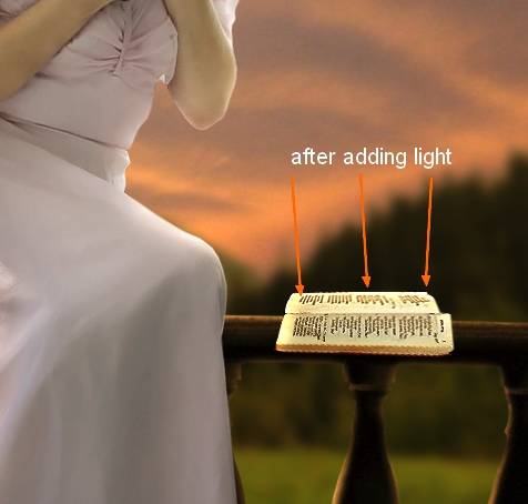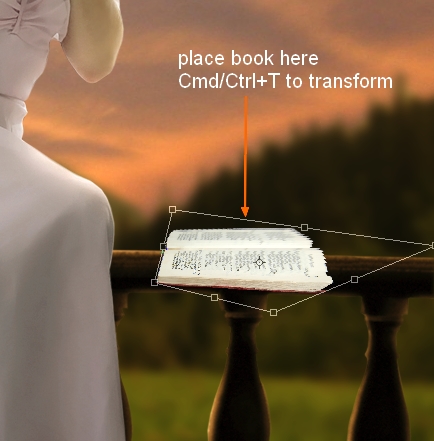 Cut out the book and place it at the right side of balcony, near model. Use transform tool ( Cmd/Ctrl+T) to change its direction and get a look it’s lying horizontally: