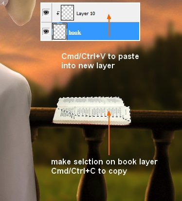 You may notice that some parts of the book too blurred. To fix it, I make a new layer with Clipping Mask for book. On book layer, make selection for blurred part, press Cmd/Ctrl+C to copy it then use Cmd/Ctrl+V to paste copied part into this new layer: