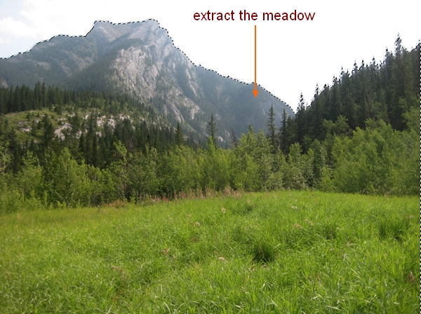 Open meadow image. Use Magic Wand Tool ( or any methods you’re familiar with) to extract the meadow from background). Drag it into our document and downsize to fit . Place it at the bottom of our picture: