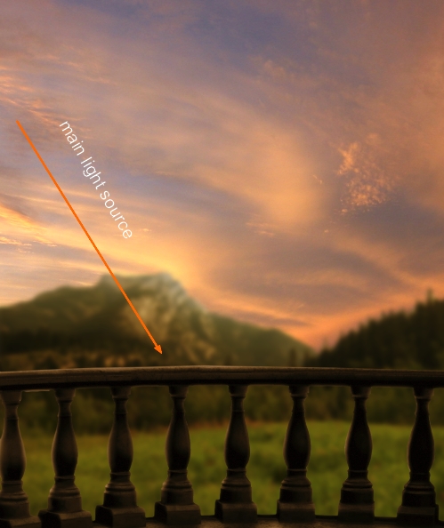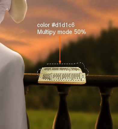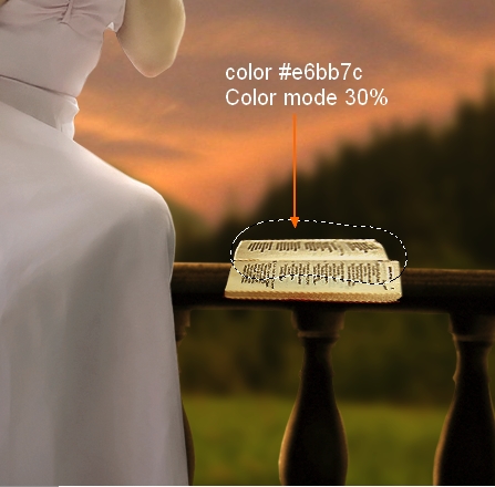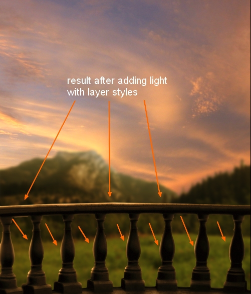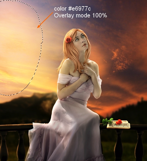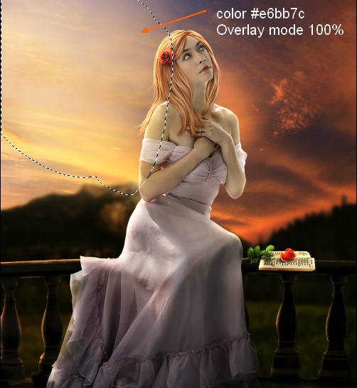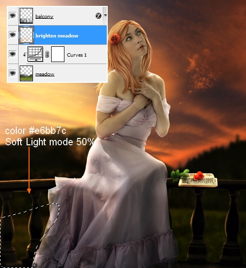 The left side of meadow should catch some light from sky so I make a new layer above meadow one and under balcony one. Use brush with color #e6bb7c paint on this side and put the mode as Soft Light 50%: