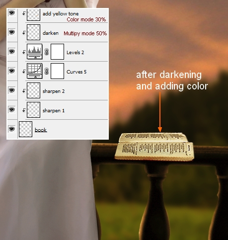 I use two new layers, one with brush and color #d1d1c6 and Multipy mode 50% to darken the book. Another with color #e6bb7c and Color mode 30% to add more yellow tone: