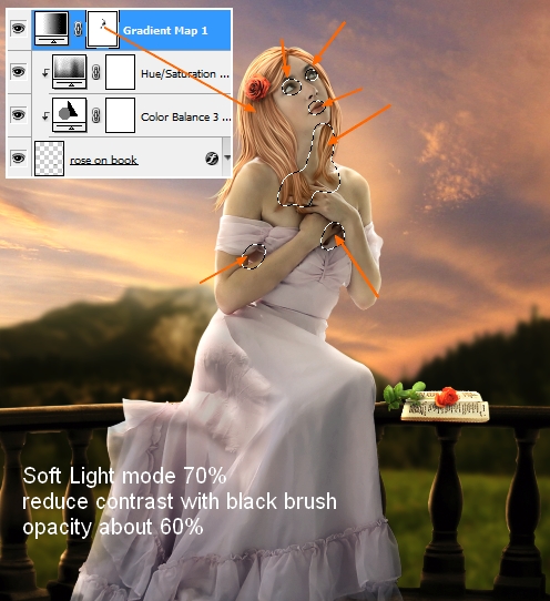 Set the mode of this Gradient Map layer to 70%. Use soft black brush with opacity about 60% to reduce dark contrast on some parts of model: