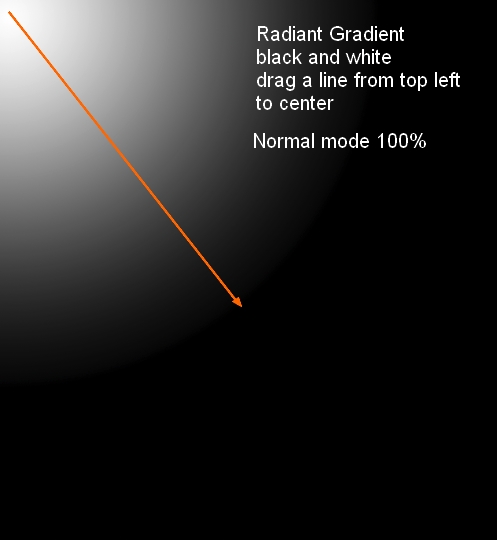 Create a new layer on the top. Hit G to active Gradient Tool then choose Radiant Gradient with default color ( black and white). Drag a line from top left to the center: