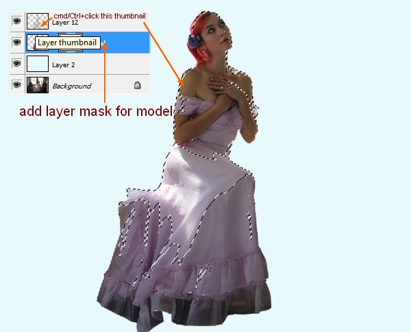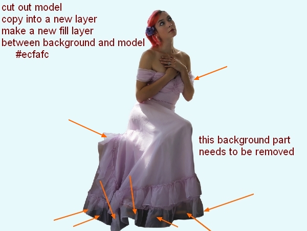 Open model stock. First use your favorite method to extract her from background. As you see I don’t take all her hair as I will paint a new one later. I make a new fill layer between extracted model and background with a light color (#ecfafc) but you can choose any bright colors you want. Also you can notice that some parts of background is still seen though transparent part of dress bottom, model arm, the back of dress and we need to remove them.
