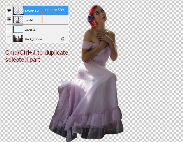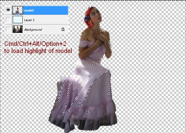 Now turrn off fill layer and background. Press Cmd/Ctrl+Alt/Option+2 to load bright part of model. Hit Cmd/Ctrl+J to copy this selection into a new layer and lower opacity to 50%: