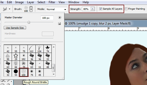 Be sure to check the ‘sample all layers’ box to ensure that your smudging will effect your underlying layers.