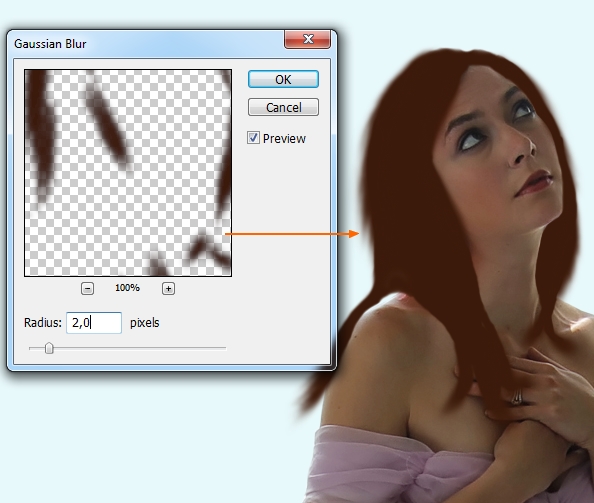 To soften the hair edges, on smudge layer, apply Gassian Blur with 2 px: