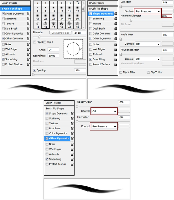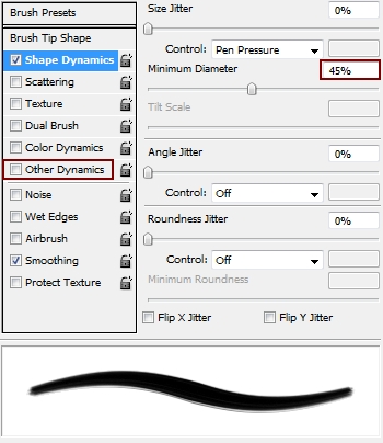 Continue with a new layer, use basic hard brush with color #9d624b and size from 4-6 px with settings like below to add some highlight strands. Remember to follow the direction of basic strands ( hair highlights usually go on the curves) but you must vary the curves as hair strokes are not always go in one position.