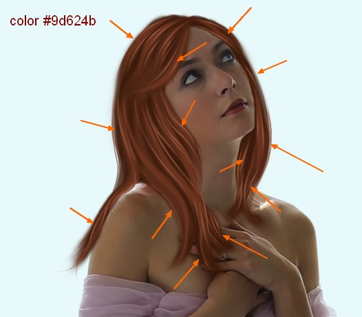 New layer and change foreground to #9a573e. Make some random single strokes to add some hightlight and break the blocks of hair strands. You can see how I add them but you can draw wherever you feel good. Don’t add too much as we will use some another colors later.