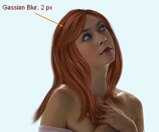 Make a new layer ( keep same brush, same color and settings), and draw some more hair strands on the top of model head then blur with with Gassian Blur, 2 px: