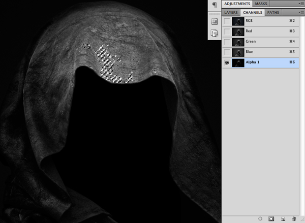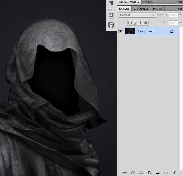 What we need to do now is create a selection inside of the hood, where we will be placing the face or skull of our character. Because the hooded figure is so dark we will need to duplicate the layer a few times just so we can make it easier on ourselves to define the edges of this shape.