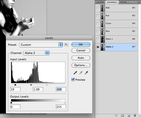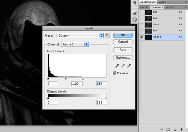 Now, if you take a look at your Channels Tab you will notice that there is a New Channel simply called Alpha 1 at the bottom of the panel. Make sure that you are working on this ‘layer’ and press Command/Ctrl + L to bring up the Levels.