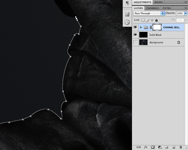 You should now see the marching ants around the figure, indicating your active selection area. Press Command/Ctrl + Shift + I to invert the selection. Make sure that you select the Layer Mask on the Group Folder and then fill the area with solid black to isolate the figure from it’s background.