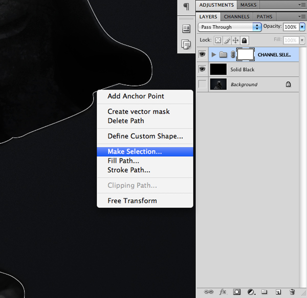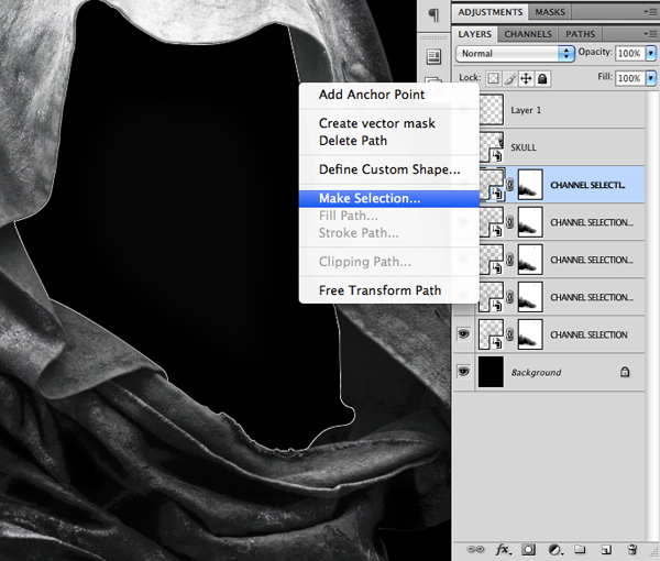 Create a new layer and begin to trace around the inner shape of the hood where the skull will be placed. Once you have closed the shape, hold down the Control Key and click anywhere along the path to bring up the menu. Choose ‘Make Selection’ as shown here: