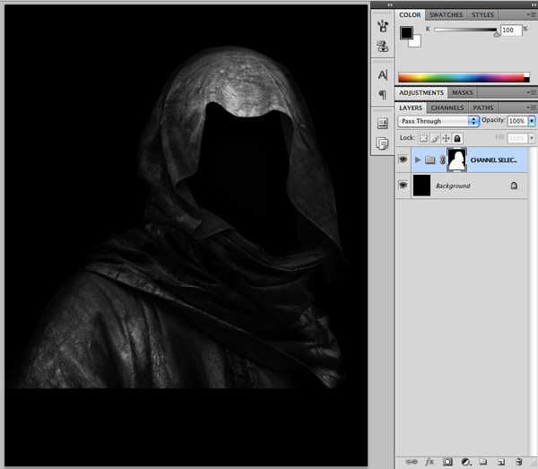 At this point you will no longer need the original image. You can also remove the solid black fill layer so that you are only left with your hooded figure. You should now have something like this: