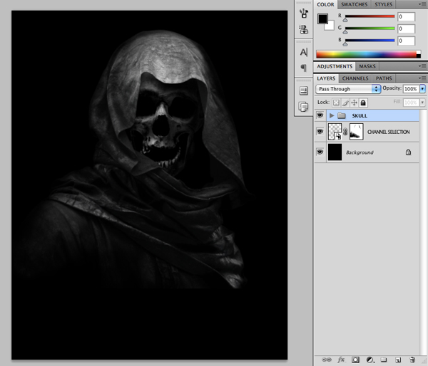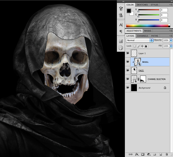 This will make it so that the skull is only visible within the shape layer that we created. From here you can then get rid of the extra copies of the hooded figure that we used in the previous step to help us define the shape inside of the hood.