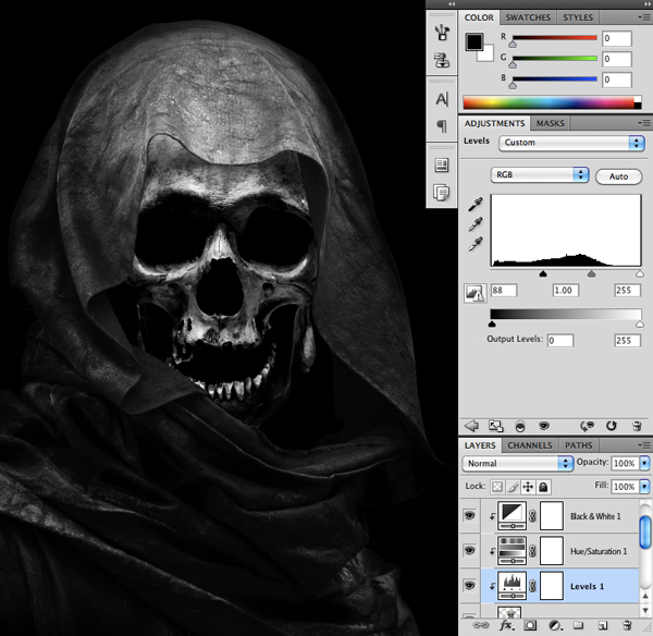Next, place a Levels Adjustment Layer above the skull and move the left slider in towards the right so that it is set to about 88 as shown here: