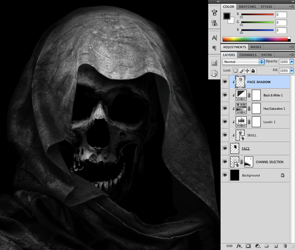 What we want to do from here is simply add another layer with a Clipping Mask and place it on top of all three of the previous Adjustment Layers. From here, switch to your Brush Tool (B) and using a soft, low opacity round brush, begin to paint in some extra black around the edges of the skull to create some shadows.