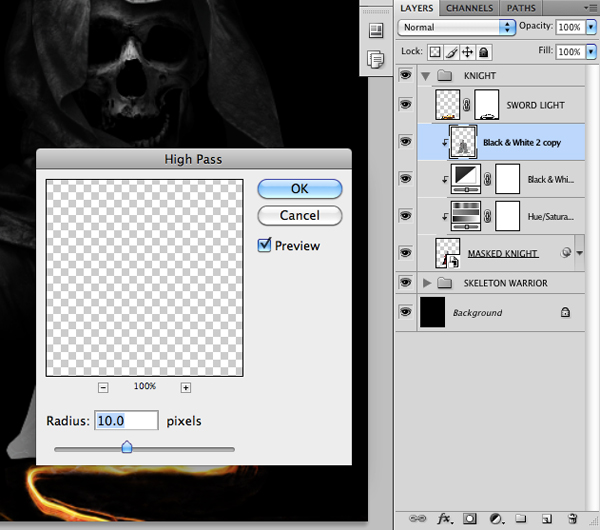 Select the ‘Masked Knight’ layer and then click on the Adjustment Layer Icon at the bottom of the Layers Palette while holding down the Control Key. Choose the ‘Black & White’ option from the menu that pops up.