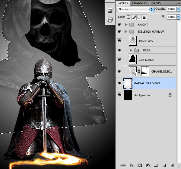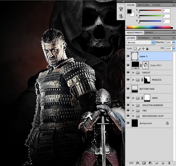 After adding this extra black layer, I went back and change the opacity of the first fill layer from 50% to about 30% as it felt a little more natural. Now we can select all of these layers except for the background and place them into one more Group Folder, which I have named ‘Skeleton Warrior’ just so we can keep track of our layers.