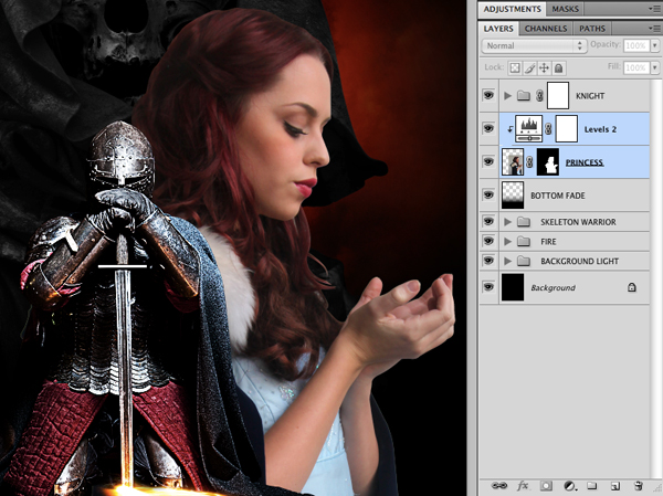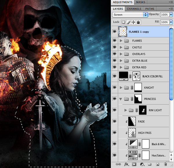From here, add a Layer Mask to the lightning and activate a selection around the princess before filling the area with black. This will ensure that the lightning only appears behind the princess, much like we did with the flames.