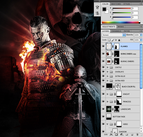 Change the Blending Mode of the embers to Screen and then use a soft round brush with a low opacity setting to remove some of the flames inside the hero. The goal here is to just have a few random flames on top of him like the image shown here: