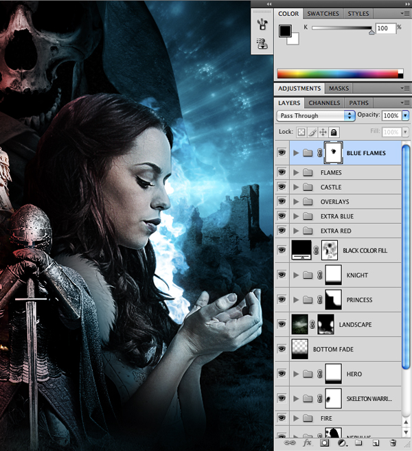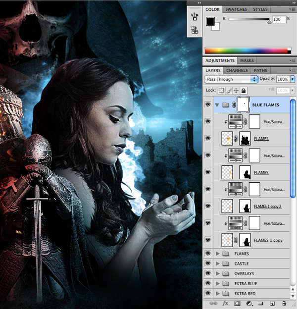 Add a Layer Mask to the Blue Flames Group Folder and remove some of the flames behind the head of the princess. At this point, most of the flames should be around the top and front of the princess as shown here: